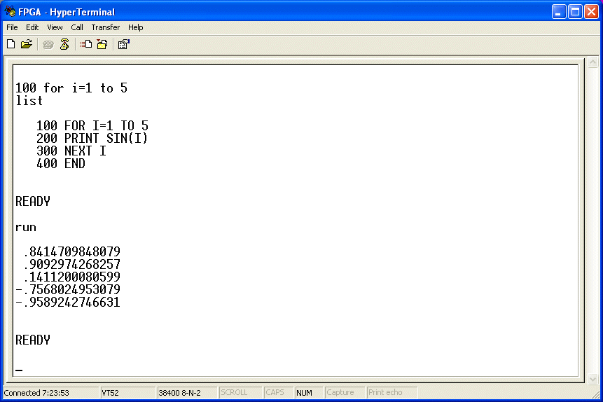 I finally got the Monitor Program running in Block RAM. This version uses 81% of the slices of a XC2S300e. The version with Slice 2KByte ROM uses 3070 out of 3072 slices so it was a pretty tight fit. I thought the ROM would use more slices than it does.