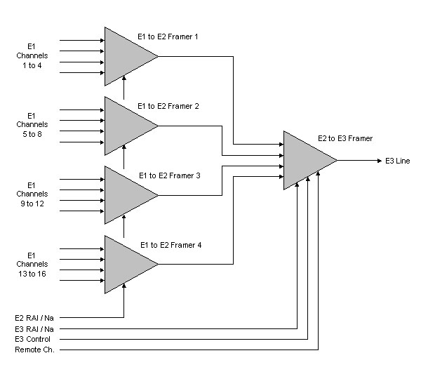 For transmitting many E1 channels over one line, the ITU describes in the standard G.742 a method for multiplexing four E1 channels to one E2 channel and in the standard G.751 a method for multiplexing four E2 channels to one E3 channel. The used technique is Time Division Multiplexing (TDM).
