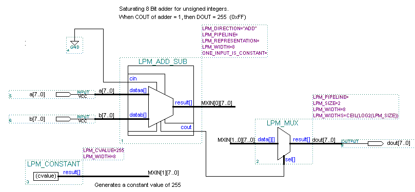 Objective:The objective of this lab is to introduce the student to a combinational logic block created via VHDL. To Do (part 1):A. The schematic below implements an 8-bit saturating adder for unsigned integers. If the carry out of the adder block is '1' indicating unsigned overflow, then the output will be clamped to 255 (0xFF). Saturating arithmetic is a common feature in 3D graphics and digital signal processing applications. You are to implement this functionality via one VHDL entity. You must use the same