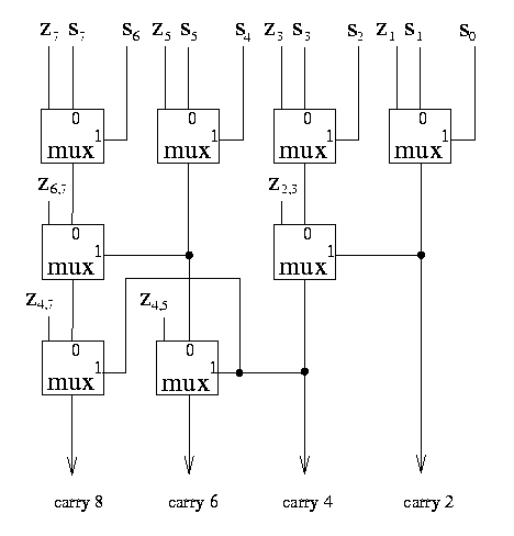 In Fig. 1 (which corresponds to Fig. 6 and 8 in [1]), the pairs of 8-bit additions are performed using carry-lookahead logic and their outputs selected according to the true value of the corresponding carry-in. Unlike the usual carry-select architecture[3], the carry terms are generated by independent logic rather than by using the results of successive adder sub-sections; this is where the speed advantage lies since the Srinivas and Parhi design uses a tree structure to achieve O(log(N)) delay.