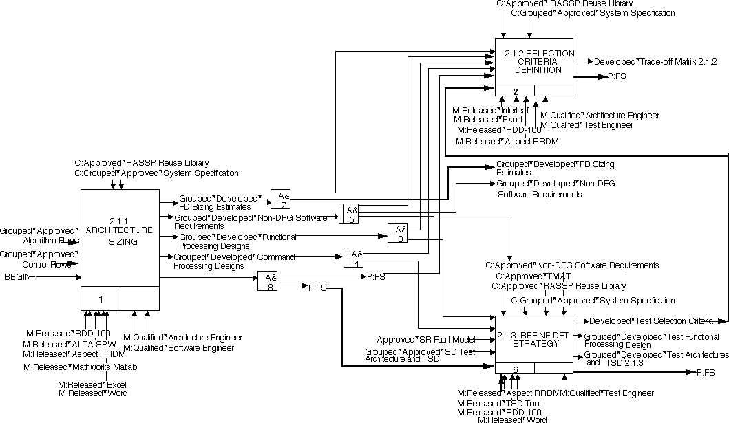 The workflow model captures: The example elaborated in this section is taken from the RASSP Architecture Definition: Functional Design workflow. Figure 3 - 1 contains a portion of the Functional Design workflow represented as an IDEF3X model. The model contains three units of behavior (UOBs) which represent design activities: Architecture Sizing, Selection Criteria Definition and Refine DFT Strategy. Also present in this model are precedence links, object state links, junction boxes, and all of the Inputs, Controls, Outputs and Mechanisms (ICOMs) for each UOB. This model was developed using the TopDown Flowcharter tool by Kaetron Software Corporation.