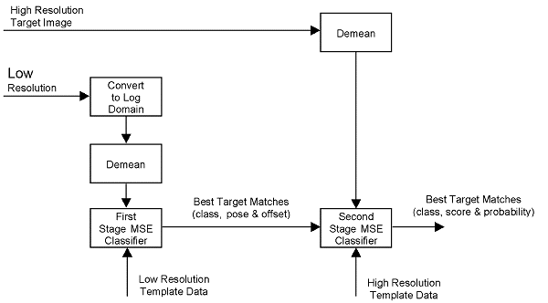 In the second stage of the classifier, scores were calculated for a set of high resolution templates files using the high resolution target image provided by the high definition imaging (HDI) subsystem. The score was calculated in the same fashion as the score in the first stage. The major difference in the second stage was that all template files were used during the first stage to determine the best match, while only a subset of templates were pose angles and offset locations used in the second stage. The subset of high resolution templates used for the second stage were based on the best low resolution target classes and their respective pose angles and offset locations. The second stage classifier returns the best target classes with their classification scores to the SAIP system.