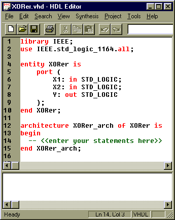 3. The HDL Editor window will now appear with the Design Wizards input and output code already defined. Scroll down to the place in the code that specifies "-- <<Enter Your Statements Here>>" in green text. This is where you will define the function of the Module. Delete the green text and in its place type the function of the logic that you are implementing. ex. For the XORer you would type "Y <= X1 xor X2;" The exact syntax and semicolon are important.